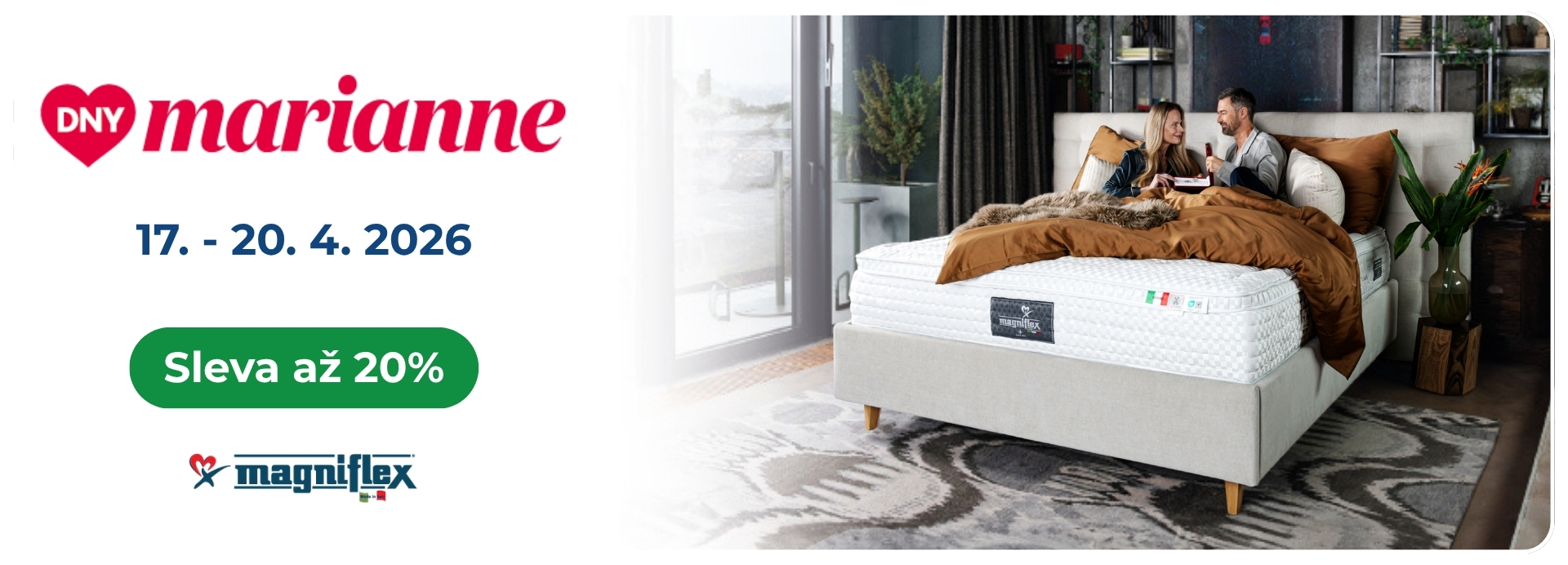 Pro uplatnění slevy musí zákazník předložit kupon Magniflex/Dny Marianne. Při platbě kartou Mastercard obdrží klient slevu 25% na polštář k zakoupené matraci. Akce platí pouze ve dnech 17. - 20. dubna 2026 a vztahuje se na matrace a polštáře značky Magniflex. Slevy nelze kombinovat s jinými slevami či akcemi.